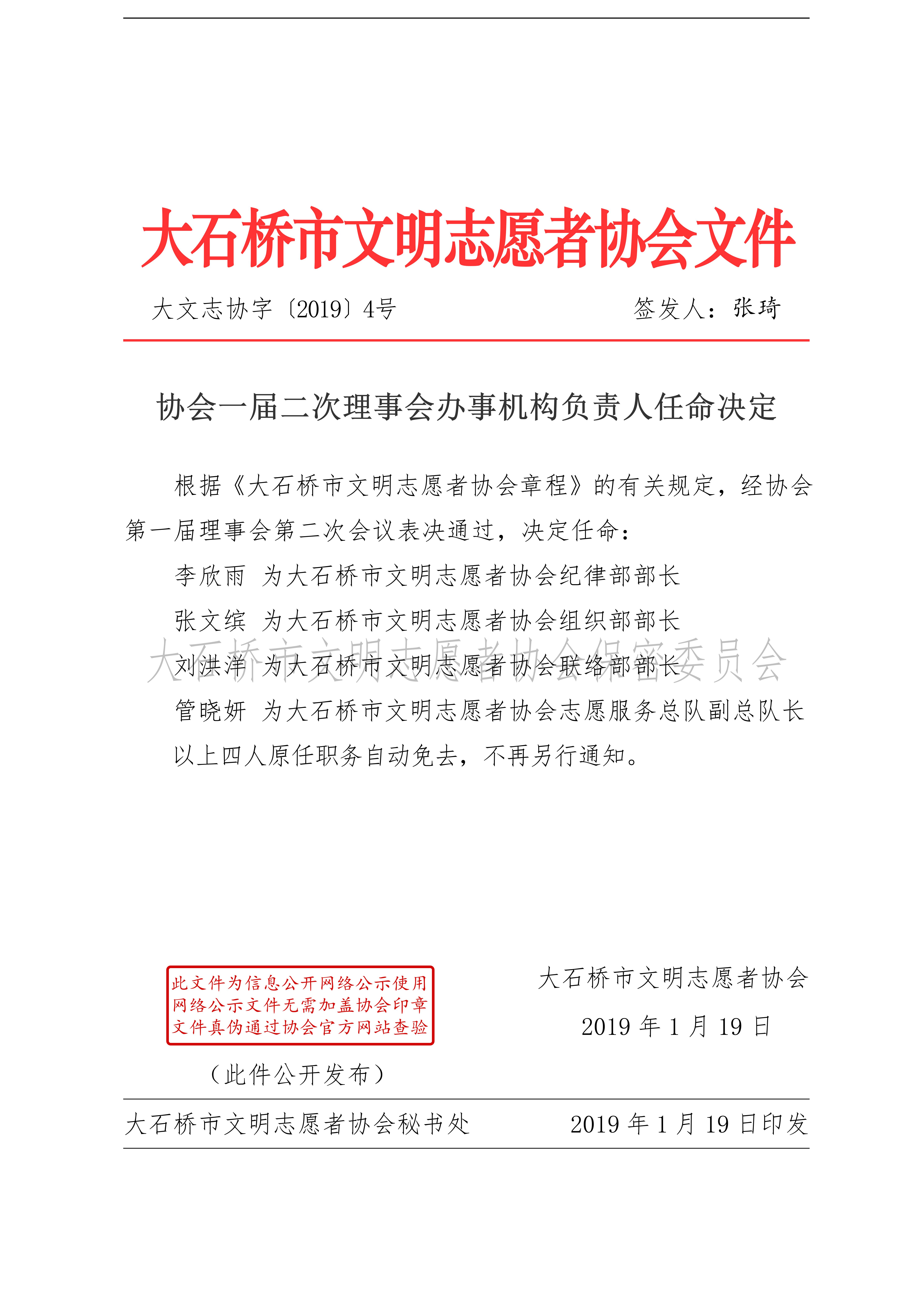 协会2019年4号:协会一届二次理事会办事机构负责人任命决定
