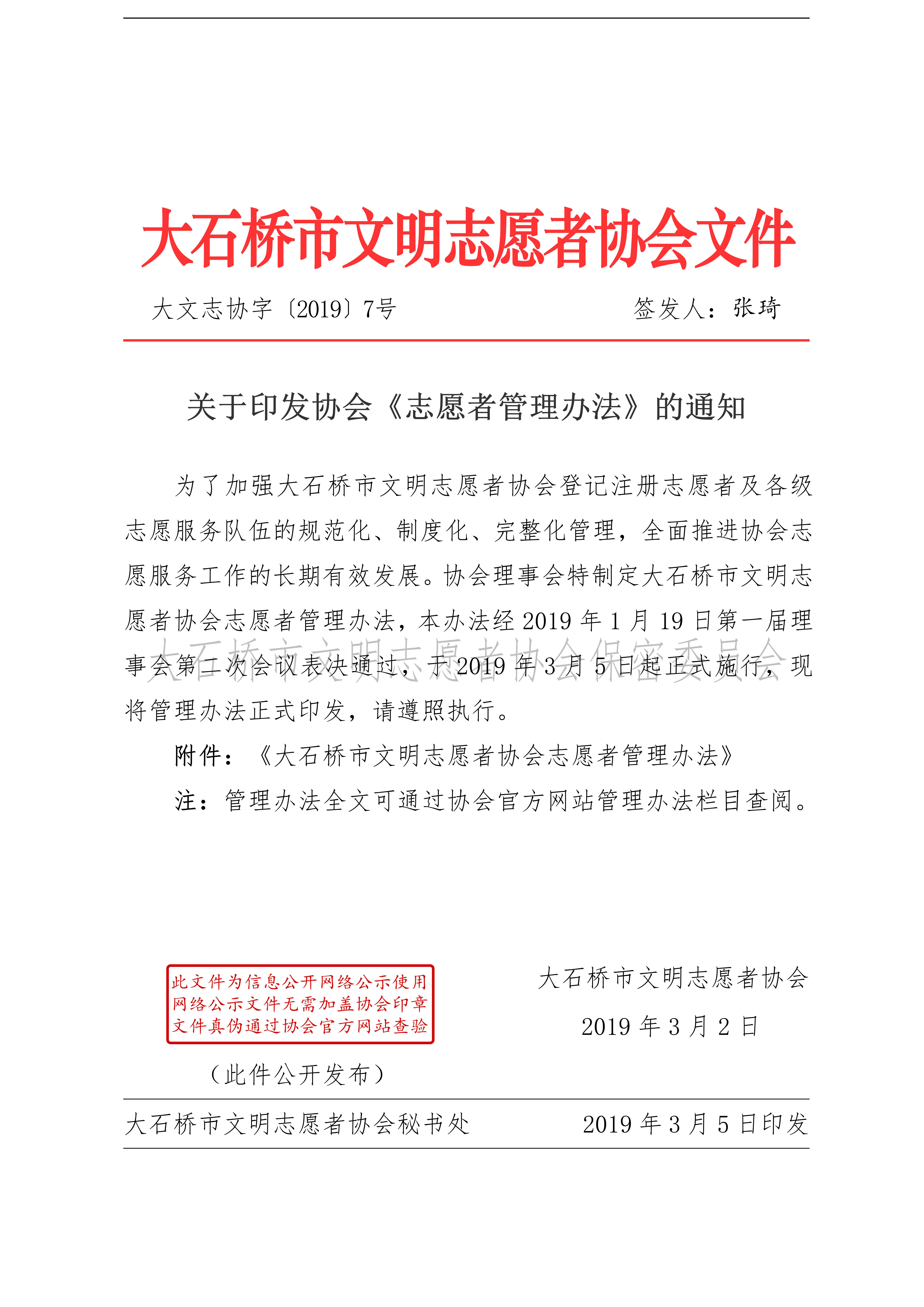 协会2019年7号:关于印发协会《志愿者管理办法》的通知
